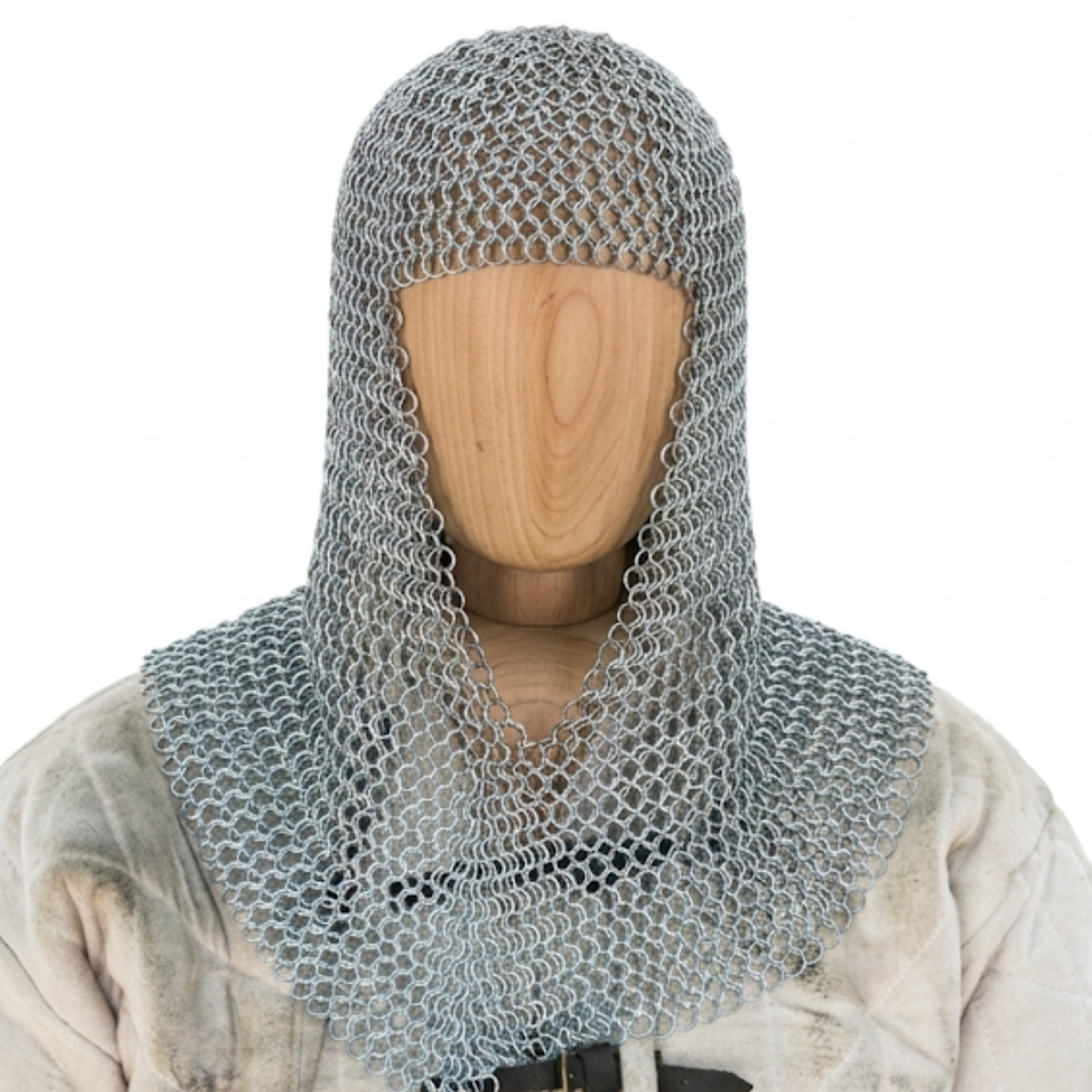 Wipe the chainmail after handling to remove moisture and dirt. Although galvanised steel provides corrosion resistance, occasional light oiling can help preserve the finish and extend durability. Store the coif in a dry environment when not in use.