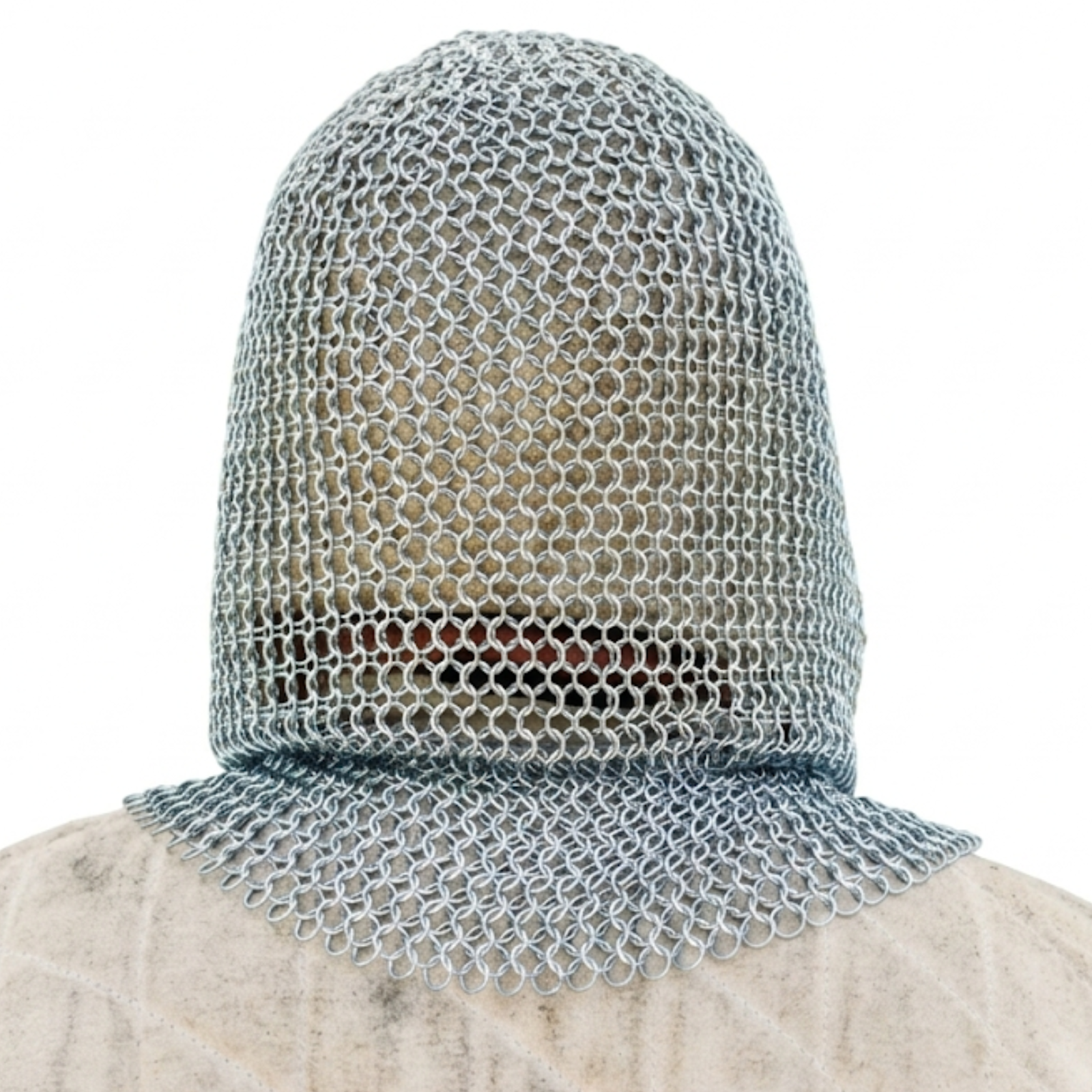 The coif is shaped to provide extended coverage around the neck, shoulders, and upper chest area. This draped design enhances protection while maintaining freedom of movement for the wearer.