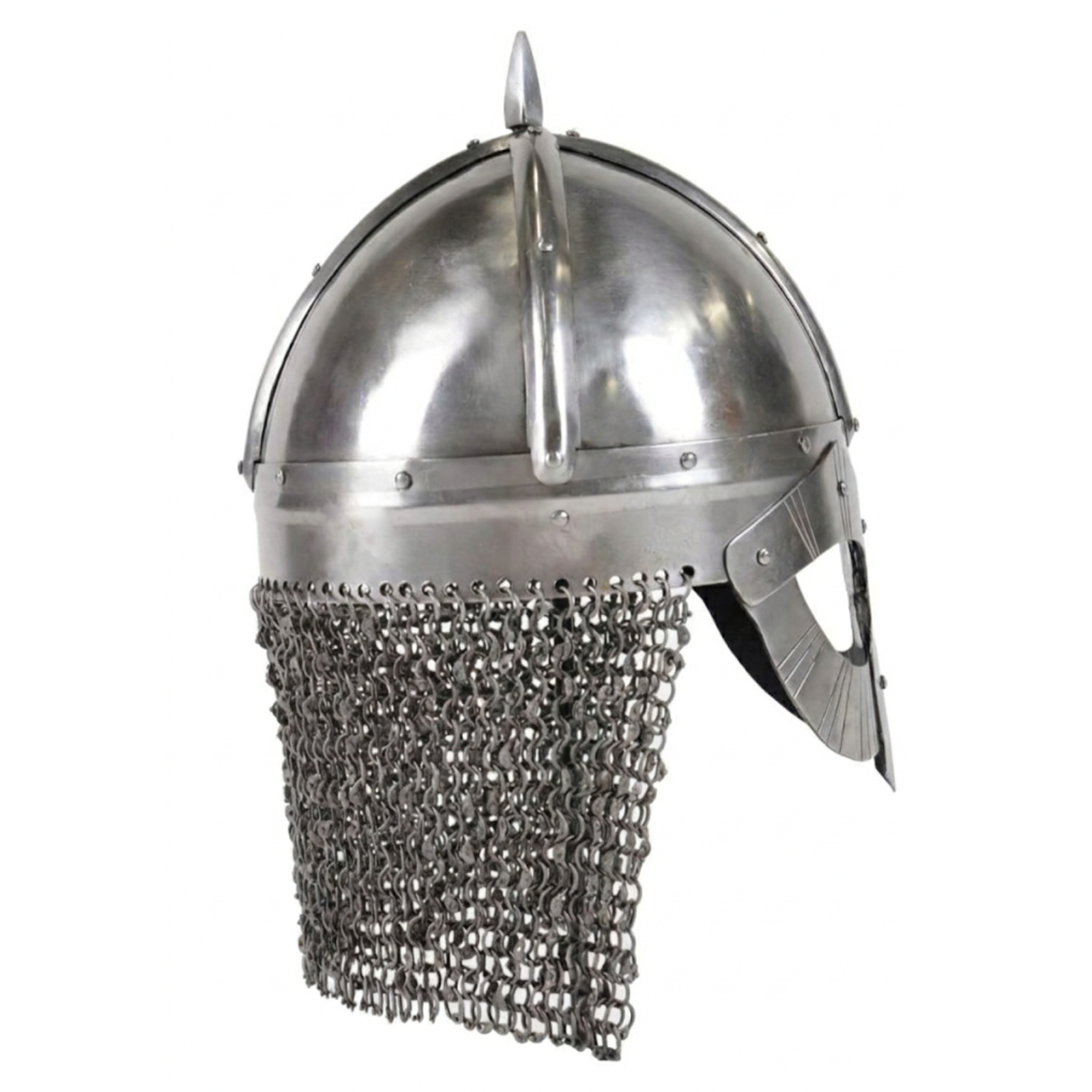 This reproduction reflects the distinctive Viking helmet design featuring a rounded dome and the characteristic spectacle-style face guard that protects the eyes and nose. Combined with a chainmail aventail, the helmet provides extended protection around the neck and shoulders. Its historically inspired construction makes it suitable for reenactment, educational demonstrations, historical displays, and collections focused on Viking-era armor.