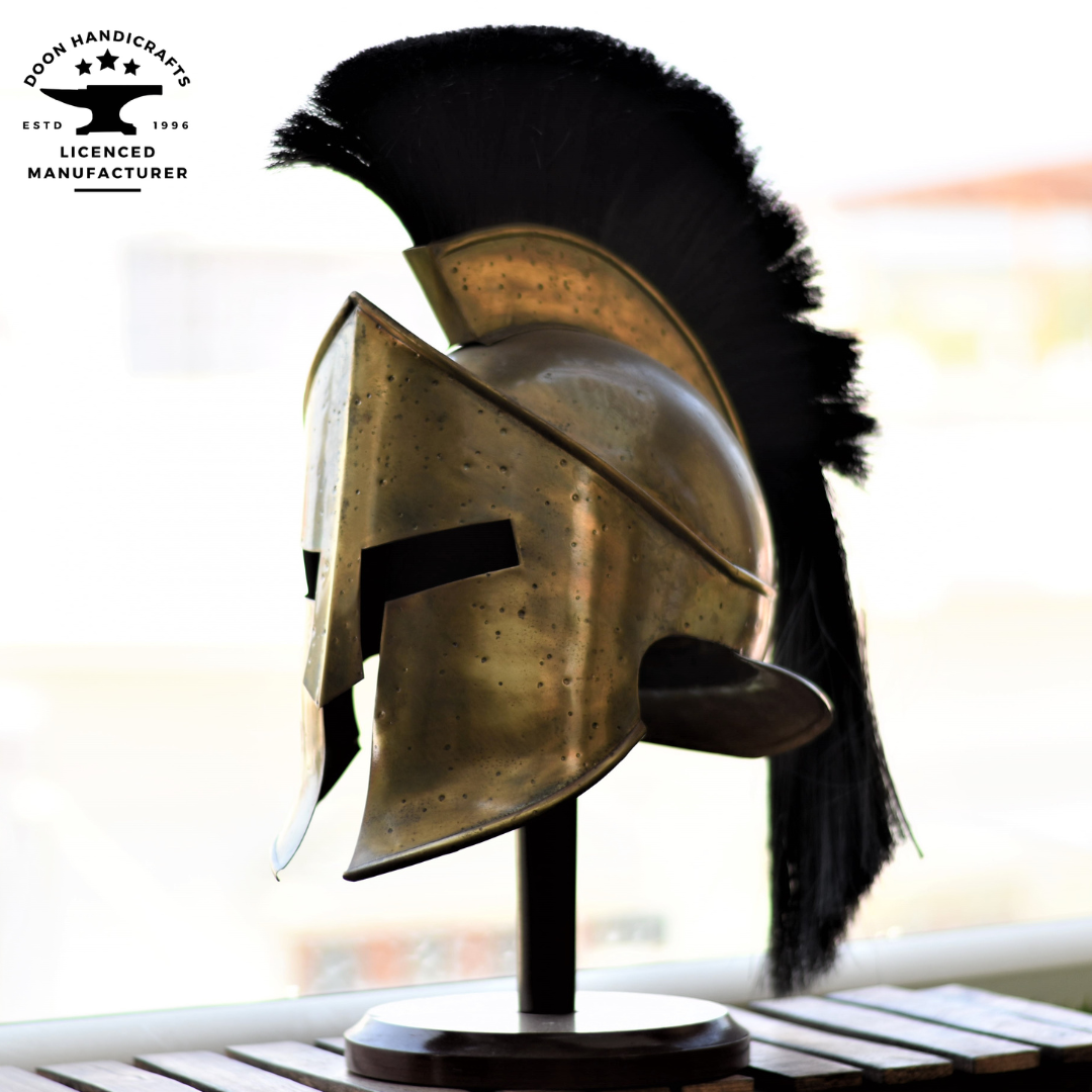 The Spartan helmet is crafted using 18 gauge mild steel, shaped through controlled hammering techniques to replicate classical Corinthian-inspired contours. Brass accent detailing enhances historical character while elevating aesthetic depth. The helmet interior includes a stitched leather liner to provide structural cushioning and fit adaptability. Surface finishing includes polishing and protective coating to reduce oxidation and maintain long-term visual integrity, making it suitable for both display and light reenactment use. The authentic Spartan Helmet design strengthens the realism of this premium bundle.
