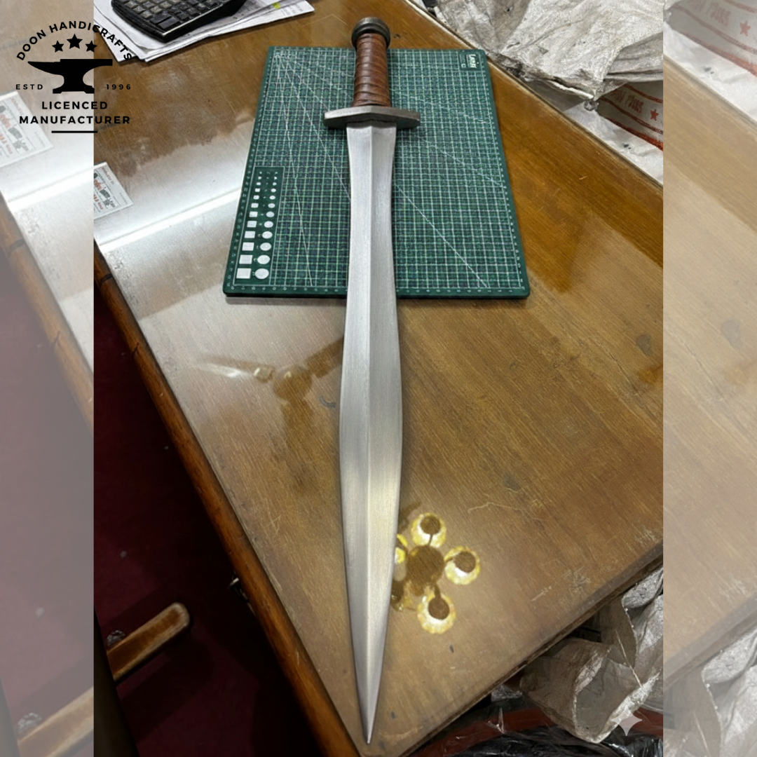 The Hoplite sword is forged from 1080 high carbon steel, selected for its superior hardness, edge retention, and structural resilience. The blade is oil-quenched and tempered to optimize impact resistance while maintaining flexibility. Its full tang construction enhances balance and handling stability, ensuring realistic weight distribution comparable to traditional Greek xiphos-style swords. The hand-forged edge is refined through precision grinding and polishing, producing a clean yet battle-authentic finish. The hilt construction is reinforced for grip integrity, offering both ergonomic handling and display elegance suited for a complete Spartan warrior costume presentation.