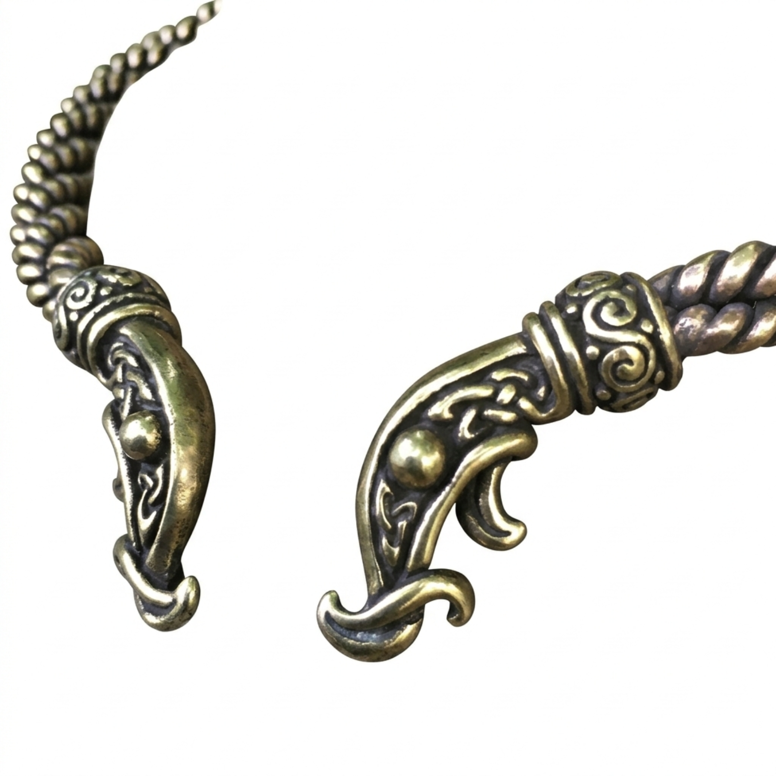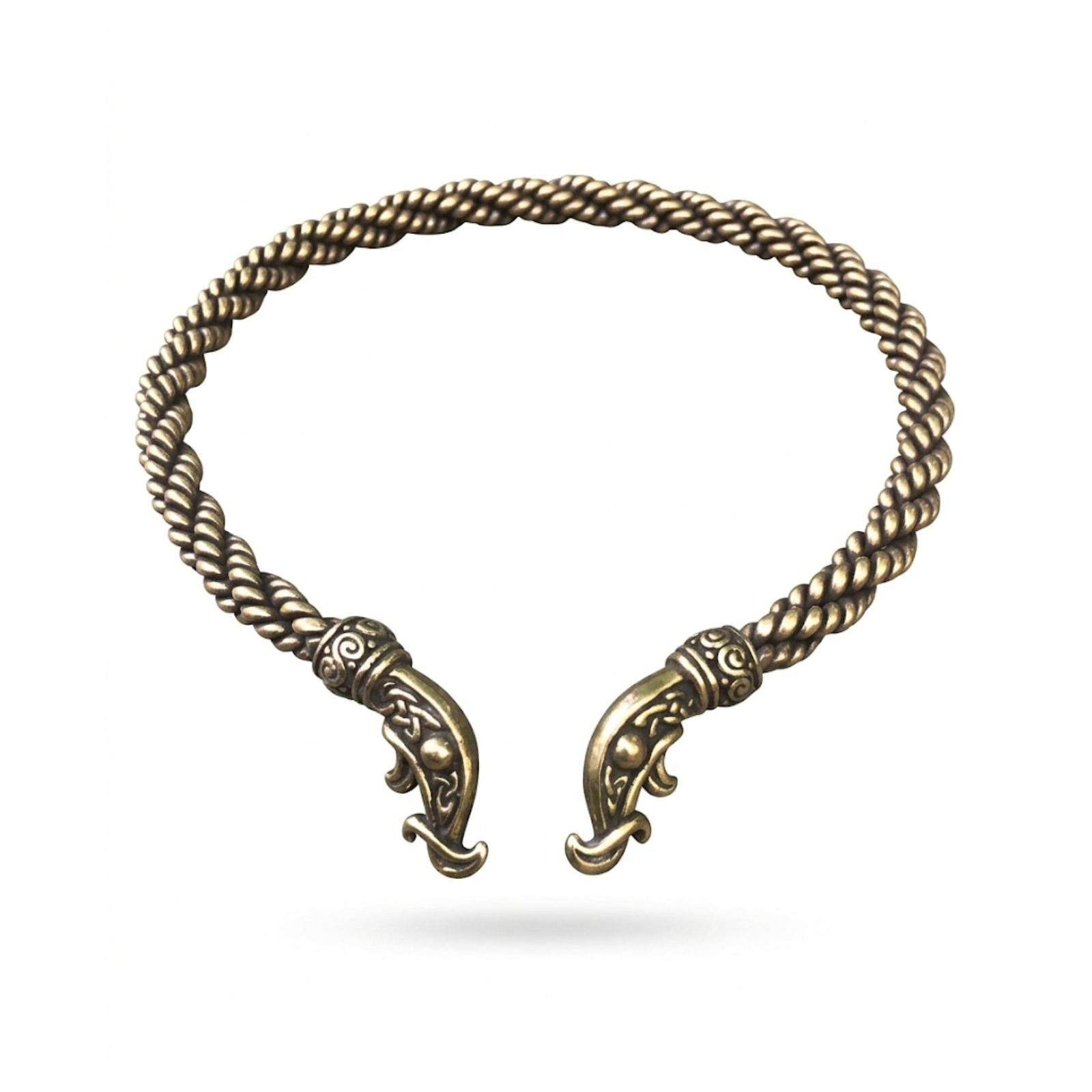The torc’s rigid yet slightly flexible construction allows it to sit comfortably around the neck while maintaining its circular shape. Careful finishing processes smooth the surface of the braid pattern and refine the decorative details, improving both comfort and durability.